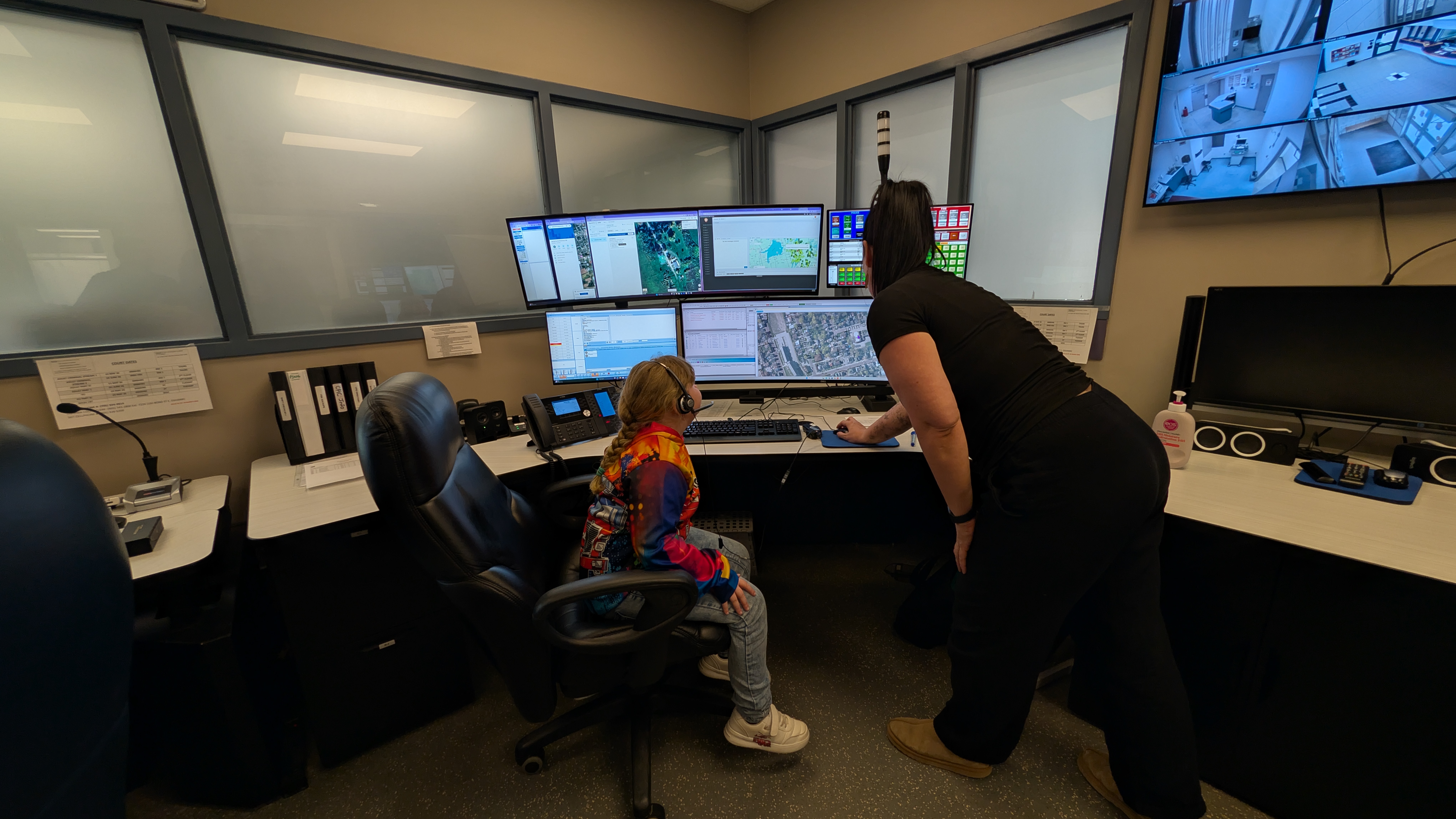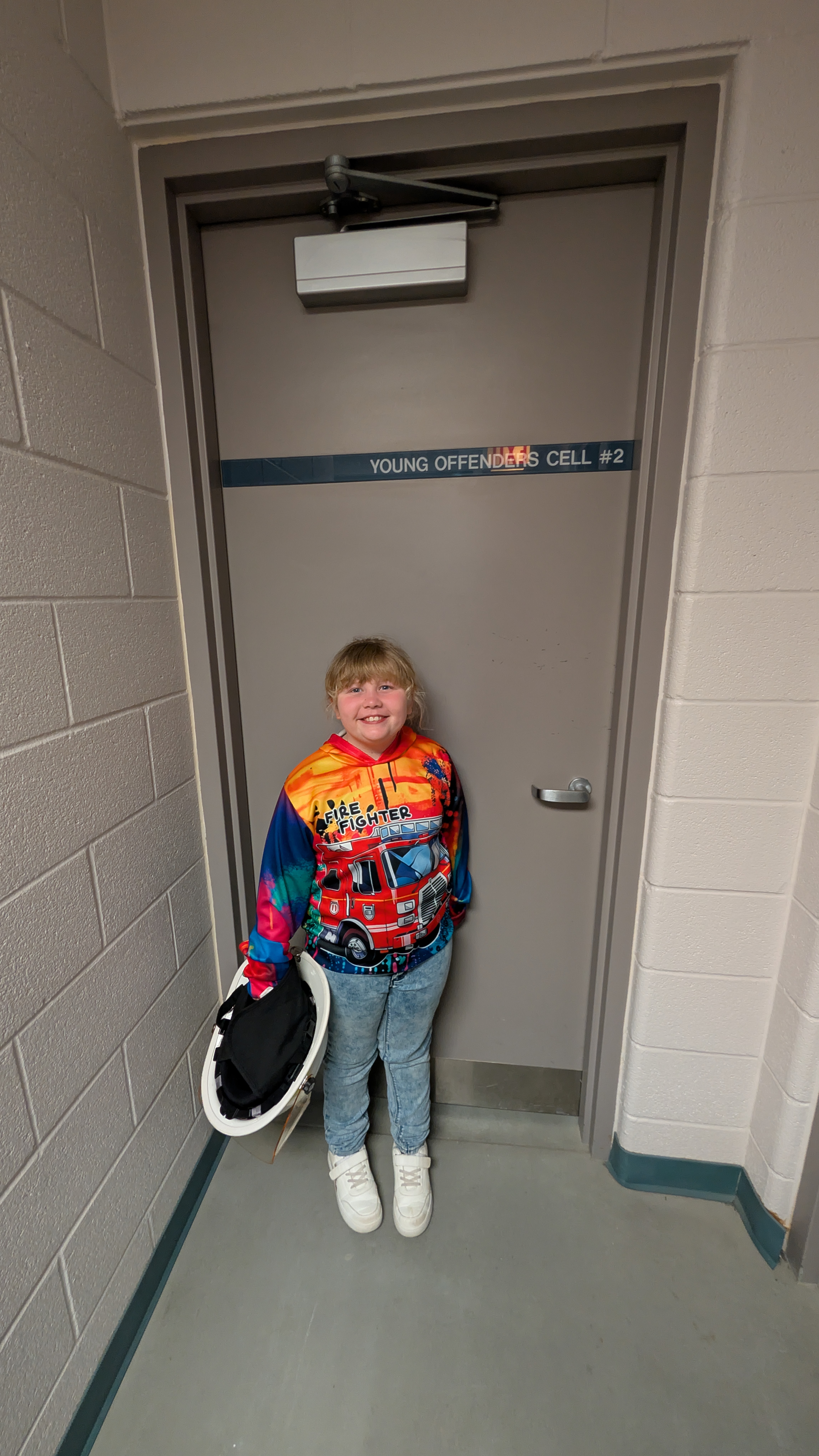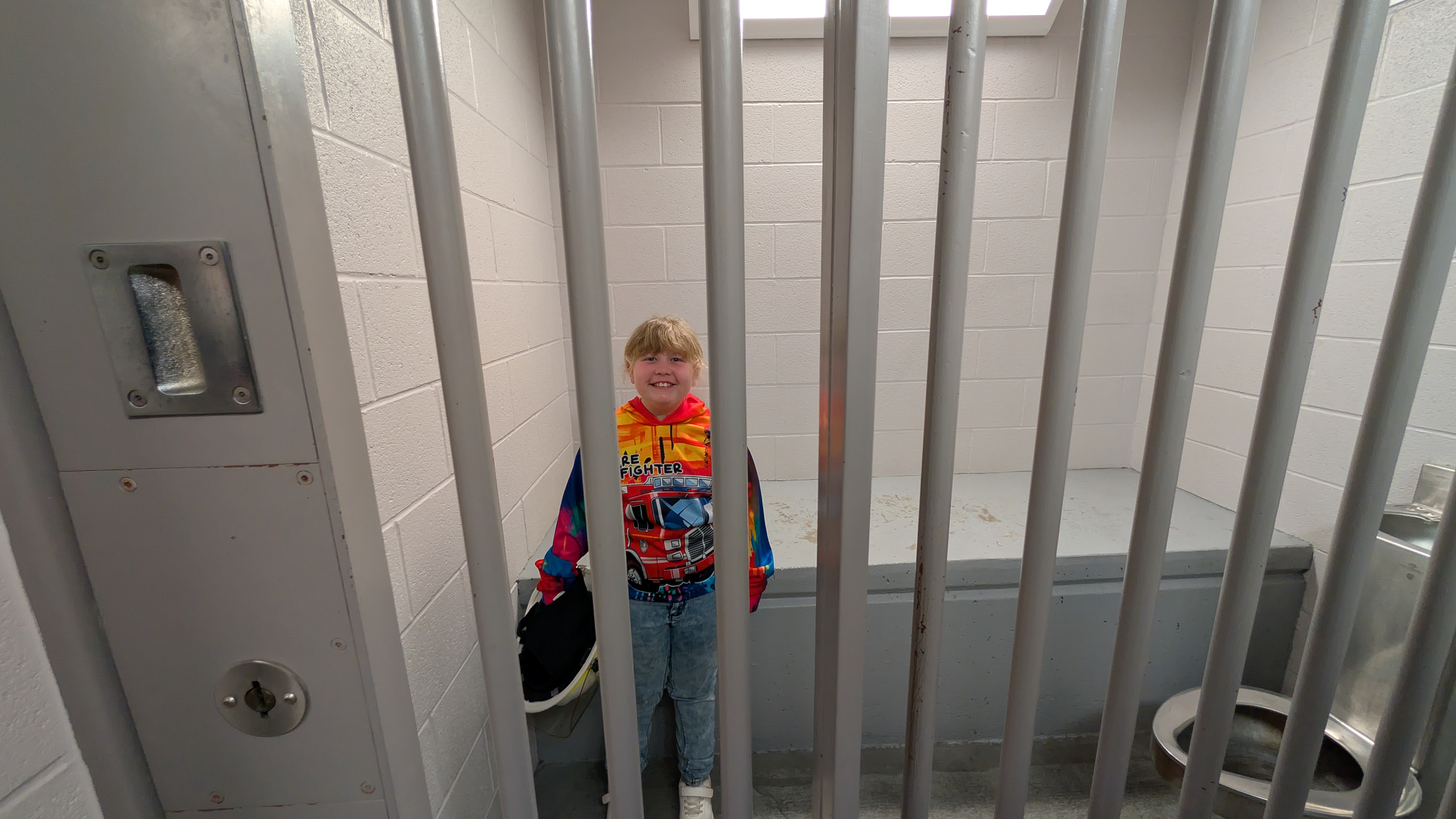 On the way back to the fire station, the group stopped at Kawartha Lakes Police Service Headquarters. Georgia was welcomed by Communications Supervisor Dylan Robichaud, who provided a tour of the facility. She met members from various divisions, visited dispatch to learn about the role of 9-1-1 communicators, toured the holding cells, and explored a police sergeant’s cruiser.